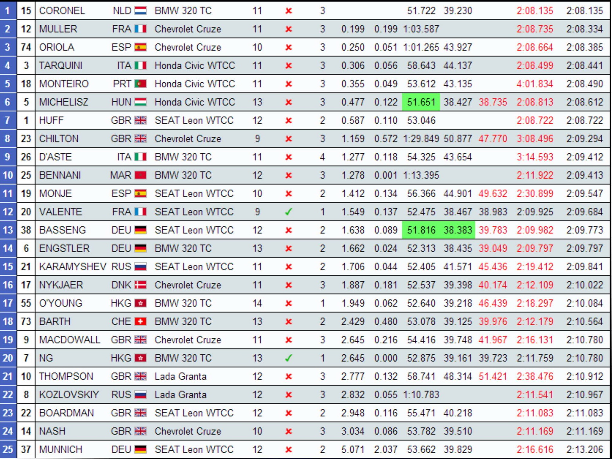 Az élen ugyanakkor folyamatosan változott a sorrend, ami teljesen normális, tekintve, hogy egy utcai pályán járunk, ahol két évente egyszer rendeznek versenyt, vagyis a pilótáknak most kell felgumizniuk az aszfaltot, aminek következtében körről körre javulnak a köridők. Az első 10 perc végén épp Monteiro vezetett Stefano D"™Aste (BMW), Huff, Tom Coronel (BMW), Michelisz, Tarquini és Yvan Muller (Chevrolet) előtt, ám mire ezt leírtam, Muller fel is ugrott Monteiro mögé a 2. helyre.