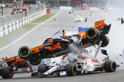 Csúnya vége lehetett volna az F1-es Belga Nagydíj első körös balesetének - Leclerc sisakja mellett néhány centiméterre húzott el Alonso autója, a sérülést a halo akadályozta meg.