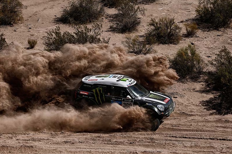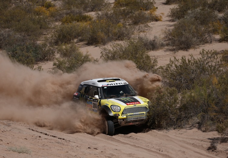 A Mini elképesztő fölényét jól mutatja, hogy öten végeztek az első hatban a márka versenyzői közül. Az egyetlen kivétel a tegnapi győztes Carlos Sainz, aki ezúttal harmadik lett az SMG Buggy volánjánál, ám hasonló a szituáció, mint Al-Attiyah esetében: a végső győzelemre nem sok esélye maradt az első héten elkövetett hibáinak és időbüntetésének köszönhetően. Nem igaz azonban ez az állítás Stephane Peterhanselre, aki ma egy második helyezést gyűjtött be, mindössze bő egy perccel elmaradva katari csapattársától, így pedig több mint nyolc percet tudott faragni a hátrányán Joan Nani Romával szemben. A spanyol Mini-pilóta hatodik lett hétfőn, így pedig hiába nyilatkozta azt, hogy innentől óvatosan, az előnyét beosztva fog vezetni, a 24 perc alá csökkenő fór már egyáltalán nem tűnik megnyugtatónak a tizenegyszeres győztes franciával szemben.