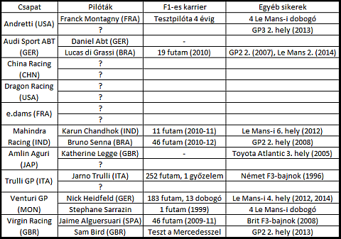 A szeptemberben induló Formula E tíz csapata közül négy már mindkét versenyzőjét bejelentette, legutóbb a Leonardo di Caprio közreműködésével induló Venturi közölte párosítását: két jelenleg a WEC-ben szereplő pilóta, Nick Heidfeld és Stephane Sarrazin alkotja majd a monacói licensszel induló csapat kettősét.
