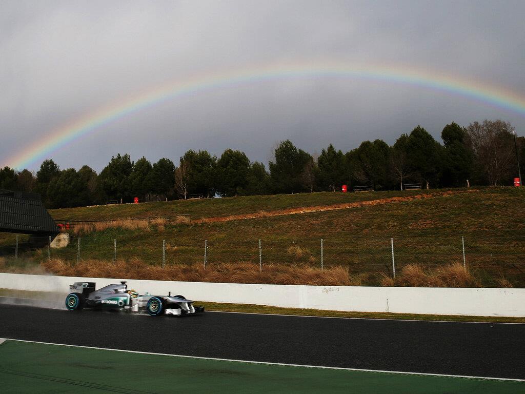 Elsőként Pic hajtott ki a nedves aszfaltra, majd Vergne, Chilton, Hamilton és Massa is követték. Húsz perccel a kezdést követően máris piros zászlót lengettek. Egy régi ismerős, Romain Grosjean keresett valamit a 14-es kanyar melletti kavicságyban, talán tavaly hagyott el valamit Barcelonában. Autóját mindenesetre a daru vette kezelésbe. Tíz perccel később már lengették is a zöldet, a pilóták pedig neki is vágtak unikornist keresni a szivárvány alatt.
