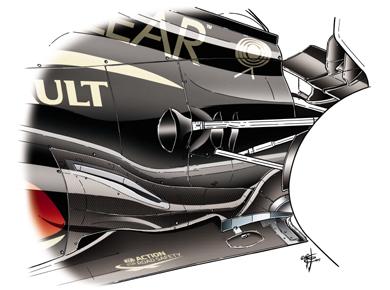 Kínában már mindkét Lotus használhatta a csapat új kipufogó rendszerét, amit Malajziában még csak Kimi Raikkönen autójára szereltek fel. A rendszer legnagyobb újdonsága, hogy a Coanda rámpa az új verzión sokkal rövidebb lett, így annak az alakja nagyon hasonlít a Red Bull által használt megoldáshoz. A hátsó keréktől való nagyobb távolság és az alacsonyabb kipufogó nyílás következtében pedig az E21-es hátsó karosszériájánál sokkal markánsabban szélesebb lehet az üvegnyak, ami pedig jobb levegőáramlást eredményez a diffúzor oldalsó része felé, tavaly a Koreai Nagydíjon a Red Bull is hasonló irányba vitte el RB8-as versenyautója fejlesztését.