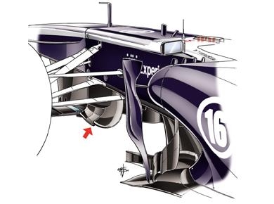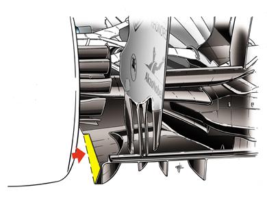 A Williams istálló a Kínai Nagydíjon csatlakozott azon csapatok sorába, akik terelőlapátokat helyeztek el az autójuk karosszériáján az orr alatt (piros nyíl). A Williamsnél az új terelőelem már a Maláj Nagydíjon feltűnt, Sanghajban pedig annak a hatékonyságát egy új első szárnnyal növelte meg a csapat.