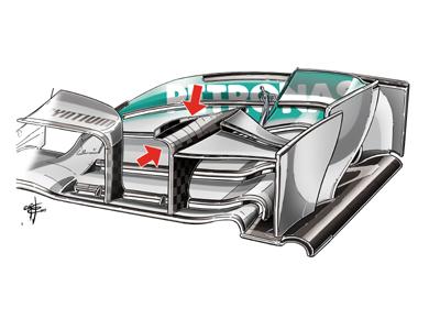 A gyors, hosszú egyenesekkel tarkított sanghaji pályára a Mercedes új első vezető szárnnyal érkezett, ahol a felső toldalékszárny jelentette az újdonságot. A csapat mérnökei pedig azt nem csak íveltebbé tették, hanem egy függőleges kis uszonnyal is ellátták (piros nyíl) annak érdekében, hogy az örvénylést váltson ki, ami pedig javítja majd az első szárnyak szívó hatását.