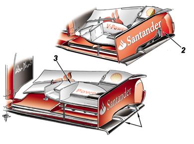 A Mercedeshez hasonlóan a Kínai Nagydíjon a Ferrari érdeklődésének a középpontjában is az első szárny állt. A maranellóiak teljesen új első szárnyat készítettek az F138-asra. Az új szárnyon (alsó kép) a csapat mérnökei két vízszintes nyílást alakítottak ki a szárny véglemezén (1-es nyíl), míg az előző változaton még csak egy volt. Továbbá eltűnt a függőleges nyílás a szárny véglemezén (2-es nyíl), valamint módosították a hosszanti uszony formáját (3-as nyíl). Az új első szárnyat kifinomultabb orr alatti terelőelemekkel egészítette még ki a csapat Sanghajban.