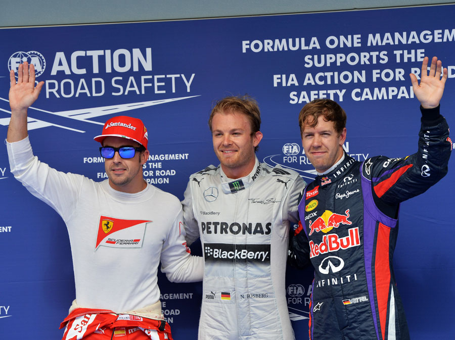 Az időmérő első három helyezettje: Rosberg, Vettel, Alonso