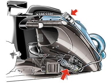 A Lotus E21-es versenyautó idei sikerének a titka sokak szerint a csapat által használt aktív hidraulikus felfüggesztési rendszer (FRIC), aminek a lelke az autó bal oldali oldaldobozában található hidraulikus meghajtó (alsó nyíl), amely hidraulikus kapcsolatot teremt az autó első és hátsó felfüggesztése között. A rendszer hasonló elven működik, mint a fékrendszerben található fékfolyadékkal működő többkörös fékrendszerek. A rendszerben fellépő nyomáskülönbségeket a kiegyenlítő tartály (felső nyíl) segítségével egyenlítik ki, amelynek eredményeképpen az autó állandó hasmagasság mellett futhat, ez pedig jótékony hatással van az aerodinamikai egyensúlyára is. A Lotus által 2011 óta fejlesztett rendszer teljesen passzív, így az minden tekintetben megfelel a technikai szabályoknak.