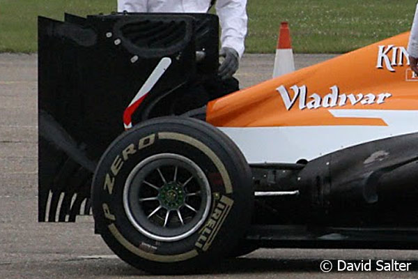 A VJM06-os Duxfordban tesztelt hátsó légterelő szárnyának véglezáró lemezeinek alsó meghosszabbításában a diffúzor oldalsó légkamrái mögött lévő légterelő lemezek is más kialakítást kaptak.