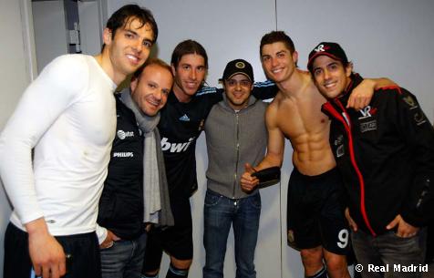 Amikor Barrichello, Massa és Di Grassi látogatta meg a Real Madrid meccsét. Kaká, Sergio Ramos és Cristiano Ronaldo társaságában.