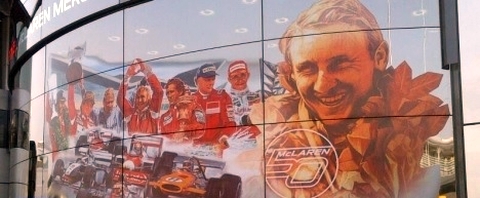 Az épület oldalán Emerson Fittipaldi, James Hunt, Niki Lauda, Alain Prost, Ayrton Senna, Mika Hakkinen és a wokingiak legutóbbi bajnoka, Lewis Hamilton látható a hétvégén néhány bajnok autóval együtt, melyek egyúttal a jellegzetes McLaren-festéseket is felidézik: a narancssárgától a piros-fehéren és a West McLarenen keresztül egészen az elmúlt évekre jellemző ezüst-vörös dizájnig. A versenyzők mellett az alapító, Bruce McLaren képe látható az 50. évfordulót ünneplő logóval együtt.