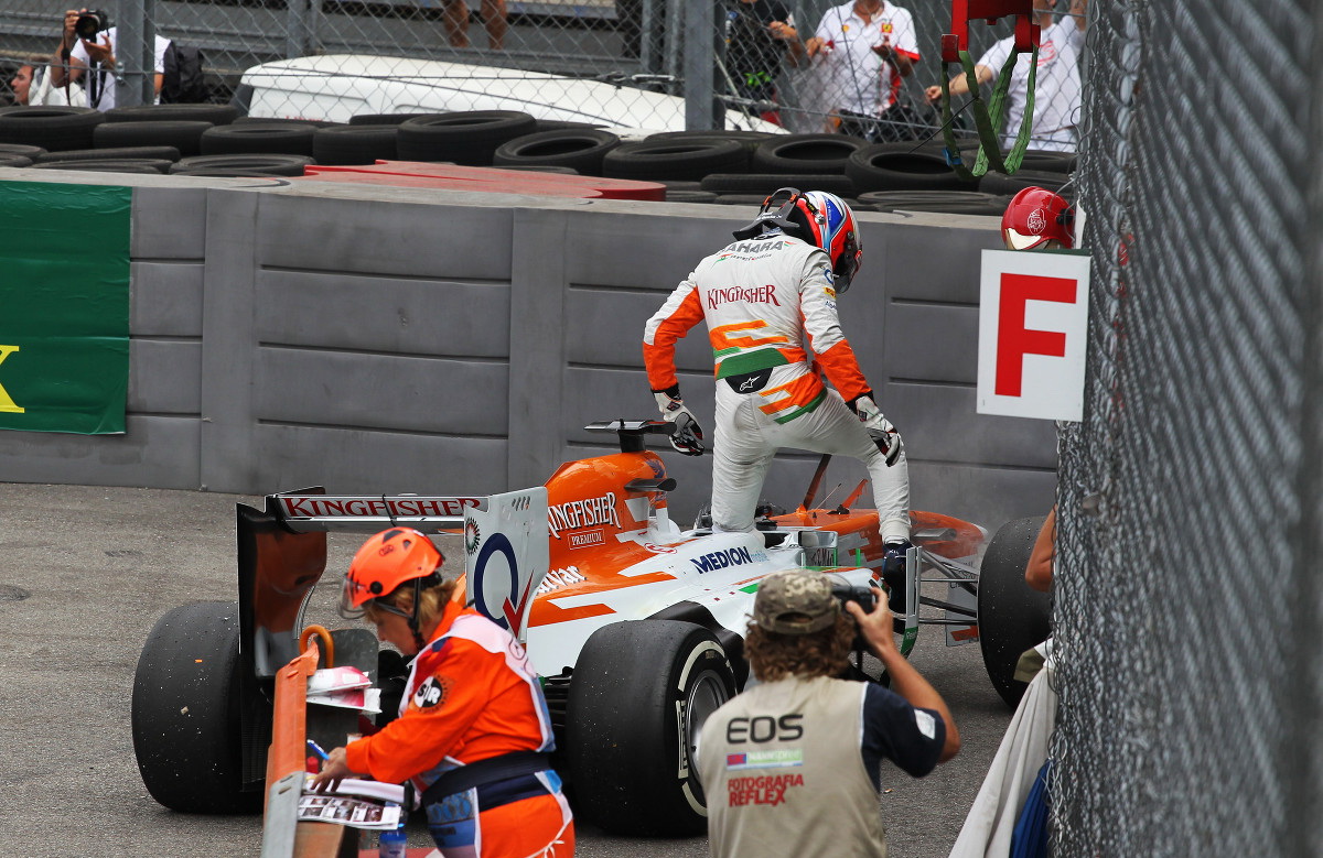 Grosjean Lotusa komolyabb sérülést nem szerzett és a nyolcadik helyen ért célba, ám di Resta feladni kényszerült a versenyt.