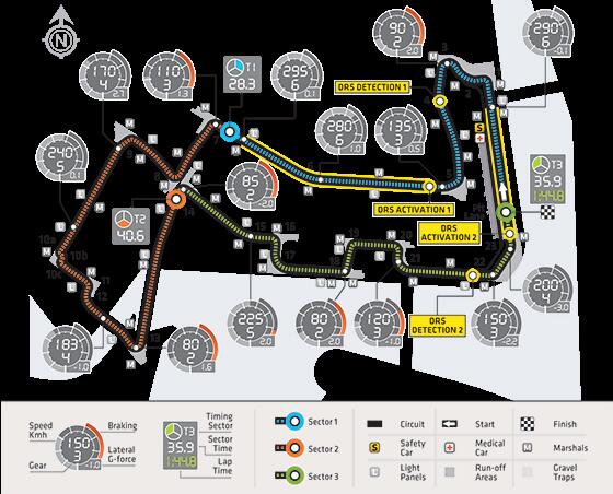 A Marina Bay-i utcai pálya nem bővelkedik hosszú egyenesekben, de természetesen azt a két szakaszt választották ki, ahol a legnagyobb hatás érhető el a hátsó szárny terelőlapjának felnyitásával. Az egyik zóna a célegyeneseben húzódik majd, és 45 méterrel az utolsó kanyart követően kezdődik, a másik pedig 50 méterrel az 5-ös kanyar után.