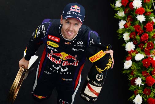 2013-ban zsinórban elért negyedik futamgyőzelmével a 26 éves német pilóta 77 pontos előnybe került a ferraris Fernando Alonsóval szemben öt futammal a szezon vége előtt. Amennyiben Vettel vasárnap megnyeri a Japán Nagydíjat és spanyol riválisa a kilencedik, vagy annál rosszabb helyen végez, akkor a bajnoki cím eldőlt.