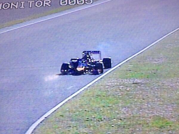 Az ausztrál pilóta egyetlen kört sem tudott megtenni új autójával, a Red Bull füstölve állt meg a pálya szélén, egészen pontosan hét kanyar után. Ricciardo természetesen azonnal kiugrott a füstölgő RB10-esből, a mentőcsapat, akárcsak a Red Bull technikai személyzete pedig pillanatokon belül a helyszínen termett.