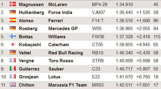 A dán pilóta szuper-lágy abroncsokon érte el ezt a többiekhez képest űridőnek minősülő eredményt. A második leggyorsabb kört futó Nico Hulkenberg több mint másfél másodperccel volt lassabb a Force India volánja mögött. Fernando Alonso fért még fel a képzeletbeli dobogó legalsó fokára, amivel folytatta a Ferrari remek bahreini tesztprogramját. A spanyol csütörtökön kereken 100 kört teljesített és mindössze egyetlen tizeddel maradt le német vetélytársától.