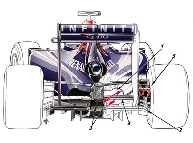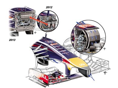 A Red Bull RB10-es versenyautójának az egyik legérdekesebb és legvitathatóbb dizájn eleme az autó orra, amelyen megtalálható a tavalyi RB9-es versenyautón is alkalmazott S csatorna rendszer továbbfejlesztett változata. Ezt az S csatornát még 2012-ben a Sauber alkalmazta először és az okos megoldás lényege, hogy csökkentse az autó orrészénél keletkező felhajtóerőt és megakadályozza a légáramlatok szétvallását, ami a szabályok által előírt alacsony orr- alváz megoldás okoz, ez pedig az idei szezonban a karosszéria és az autók orrmagasságára vonatkozó szabályok ismételt csökkentése miatt még fontosabbá vált. A képen a kék nyilak jelölik a levegő útját a karosszérián keresztül, az orrkúpon és a karosszéria alsó részénél belépő levegő pedig áthaladva a teljes orrészen végül a karosszéria felső részénél távozik. A fő képen és a jobb oldali kis képen az is jól megfigyelhető, hogy a Red Bull mérnökei a levegő karosszérián belüli útját is teljesen áttervezték, valamint a fékfolyadék munkahengerei az idei szezontól már a légáramlatokat segítő burkolat elő kerültek az orrban.