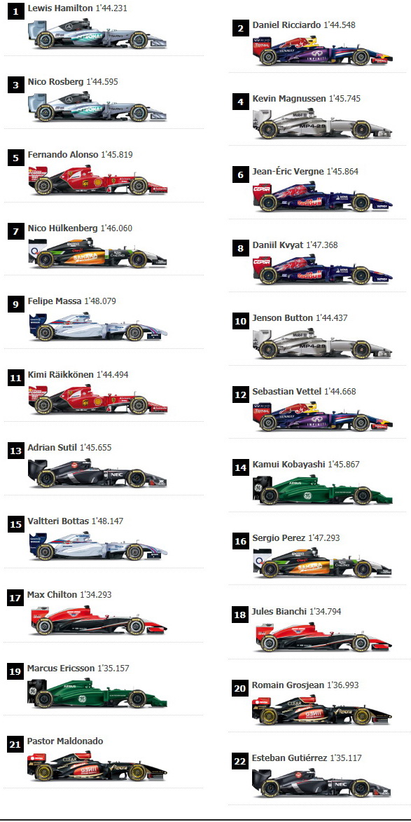 A Sauber pilótája, Esteban Gutierrez csak a 19. helyen zárt, de az utolsó pozícióból indulhat, miután szombaton délelőtt autójában sebességváltót cseréltek. Bottas szintén sebességváltó csere miatt a tizedik pozícióból a 15. helyre kerül hátrasorolásra.