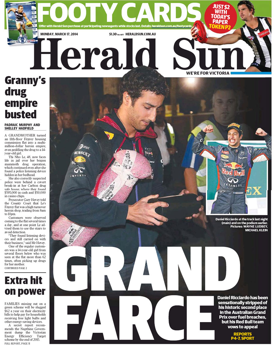 Az ausztrál média enyhén szólva is lesújtóan vélekedik az elmúlt hétvégén elstartoló új F1-es éráról. Védelmükben szól az is, hogy ezeket a véleményeket még azelőtt adták a világ tudtára, hogy hazai pilótájukat, Daniel Ricciardót megfosztották volna második helyétől.