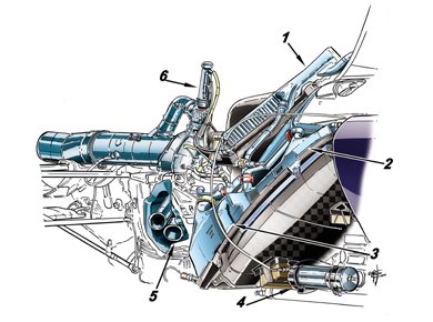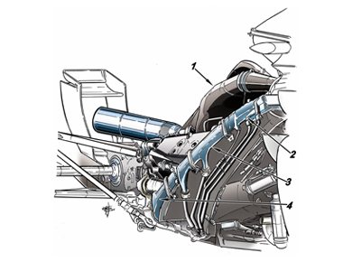 Az új V6-os erőforrás egységek megnövekedett hűtési igénye miatt a hűtési rendszerek kiemelt figyelmet kaptak a csapatoktól az idei szezonra. A Williamsnél is, az angol gárda azonban egy nagyon egyszerű hűtési rendszer vonalvezetést választott. A rajzon az 1-es nyíl mutatja a turbó légbeömlőjét, a 2-es nyíl az autó olajradiátorát, a 3-as nyíl a vízhűtőt, míg a 4-es nyíl az intercoolert, amelyet a csapat mérnökei érdekes módon egészen mélyen helyeztek el.