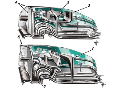 A Mercedes egy új első szárnyal (alsó kép) is készült az Ausztrál Nagydíjra, végül azonban azt még sem használták a futamon. Az új szárnyon a legnagyobb látható különbség egy kis függőleges terelő elem (1-es nyíl) volt, amelynek a felső kiszélesedő részét megcsavarták (2-es nyíl). A második terelő elem (3-as nyíl) az új szárnyon elvesztette az L alakját, valamint új lett a szárny véglemeze (5-ös nyíl) is, amely a régi változaton két különálló elemből állt (4-es nyíl). A szárny alsó része (6-os nyíl) is jelentős mértékben megváltozott, a főelemén ugyanis egyetlen egy rést alakítottak ki, mag a fékszárnya három eleművé vált.