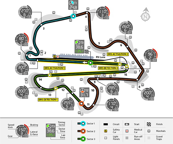 Ezúttal mindkét szakaszon, a 14-es és a 15-ös, valamint a 15-ös és az 1-es kanyar között is használható lesz a felnyitható hátsó vezetőszárny. Az első zóna érzékelési pontját 54 méterrel a 12-es kanyar után helyezték el, és 104 méterrel a 14-es után lesz aktiválható.