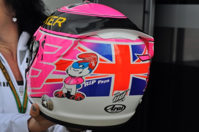 A sikerek elmaradása miatt a McLarennél hatalmas nyomás alatt álló Jenson Button édesapjára emlékezve nemcsak a rózsaszín "œPink for Papa" pólókat népszerűsíti, hanem egy speciális, rózsaszín, sisakmintával készül hazai futamára.