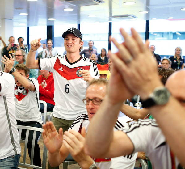 Lewis Hamilton hazai versenyét a másik Mercedes-versenyző, Nico Rosberg hazai futama követi - ennek kapcsán tett egy nagy vihart kavaró megjegyzést a brit nemrég, miszerint a Német Nagydíj nem Rosberg hazai versenye, mivel Monacóban nőtt fel, és most is ott él. A német lapok természetesen felháborodtak: "Ostoba és felesleges támadás volt" - írja a Bild, a Sport Bild pedig a német válogatottnak szurkoló Rosbergről közölt képet, aki a Nationalelf tegnapi történelmi sikerét is megünnepelte, amiről a Facebookon is közölt egy fotót.