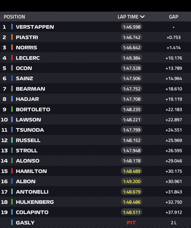 Verstappen, Piastri, Leclerc, Norris, Ocon – így fest az első ötös sorrendje.