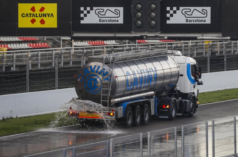 A délelőtti program az esős és az átmeneti abroncsok tesztelésével telt Barcelonában, miután negyedmillió liter vizet locsoltak a pályára az éjszaka folyamán.