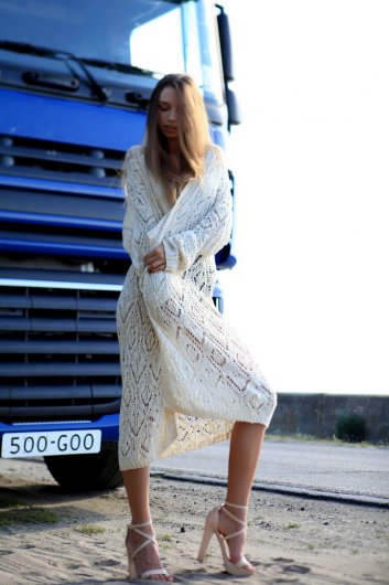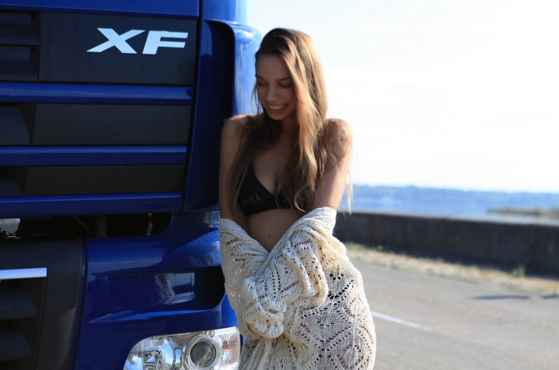 Egy csinos modell bemutatja, hogy milyen kényelmes is tud lenni egy kamion vezetőfülkéje.