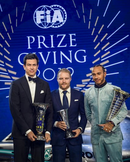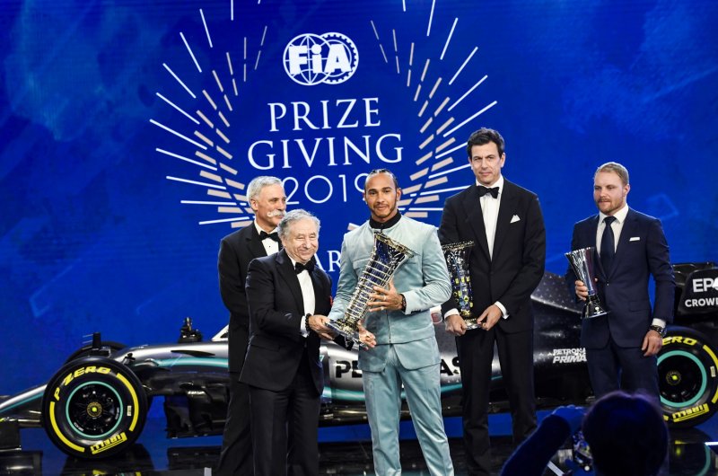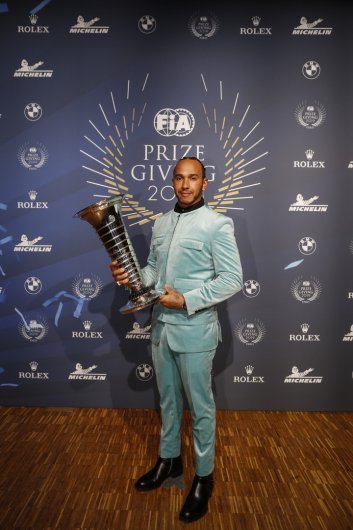 Párizsban tartott díjátadót az FIA, Lewis Hamilton egyedi öltönyben vette át a hatodik világbajnoki címéért járó trófeát.