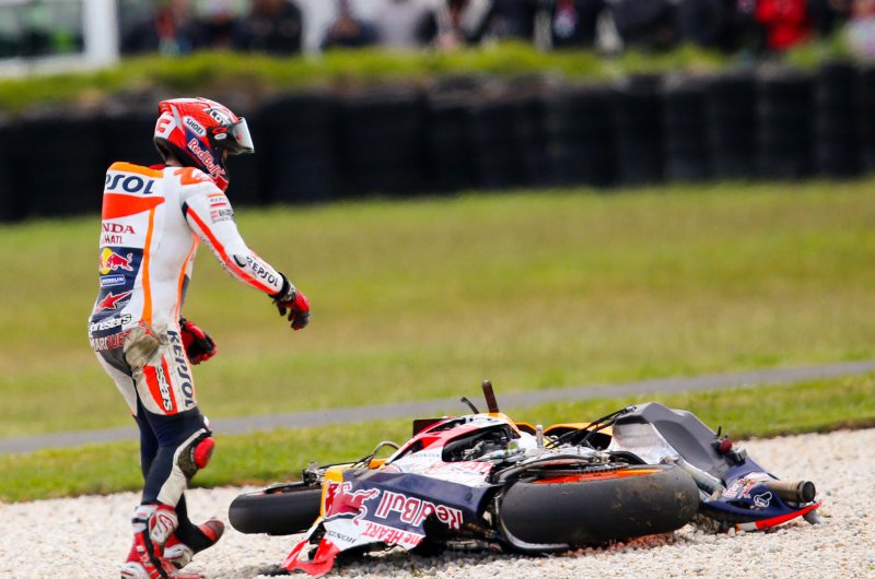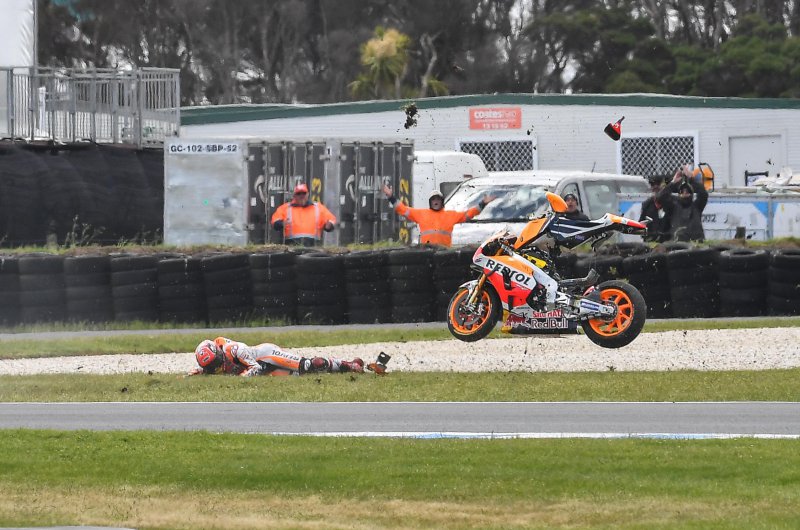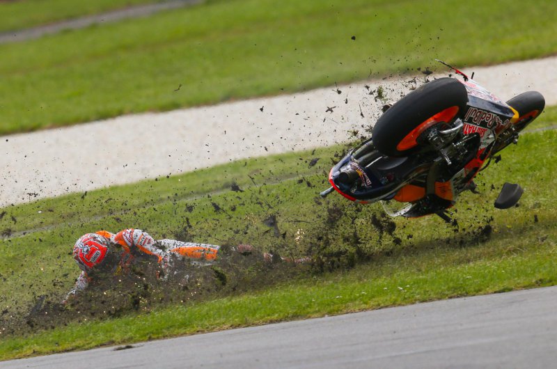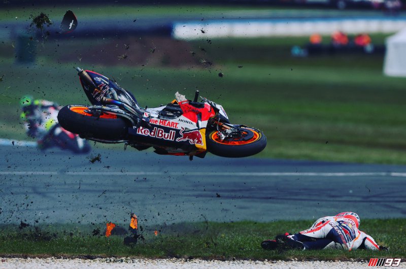 Hiába vezetett a verseny elején a pole-ból induló világbajnok, idei első nullázását volt kénytelen elkönyvelni, Crutchlow pedig köszönte a lehetőséget, és behúzta idei második győzelmét. A dobogóra a 15. helyről induló Valentino Rossi és a 13. kockából startoló Maverick Vinales állhatott még fel. Fotók: MotoGP, Marc Marquez Twitter