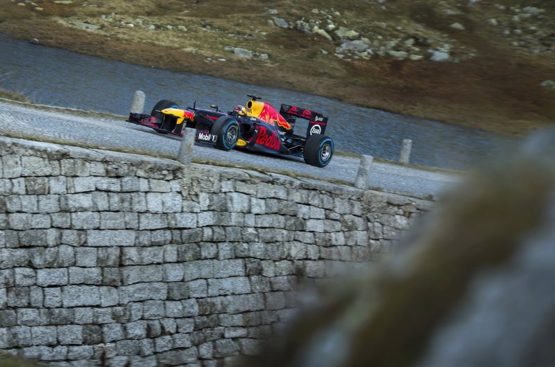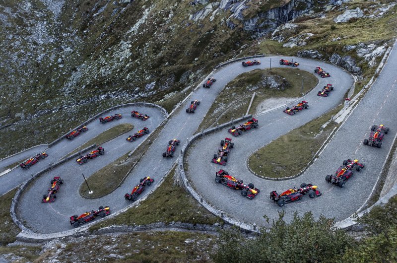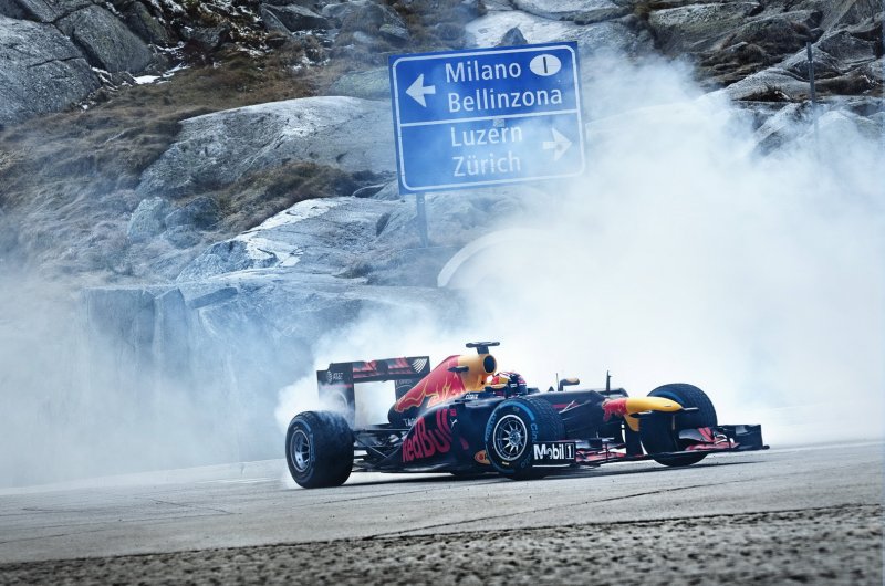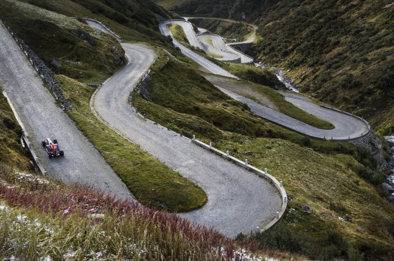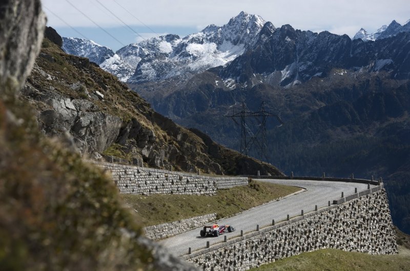 Újabb extrém helyszínen parádéztak az energiaitalosok: az F1-et is megjárt Sebastien Buemi ezúttal még a rómaiak által is használt, hegyekben kígyózó svájci Tremolastrassén hajtotta meg a vb-címet is nyerő RB8-ast.