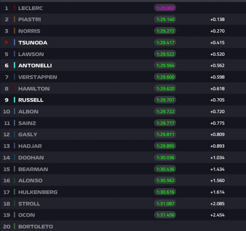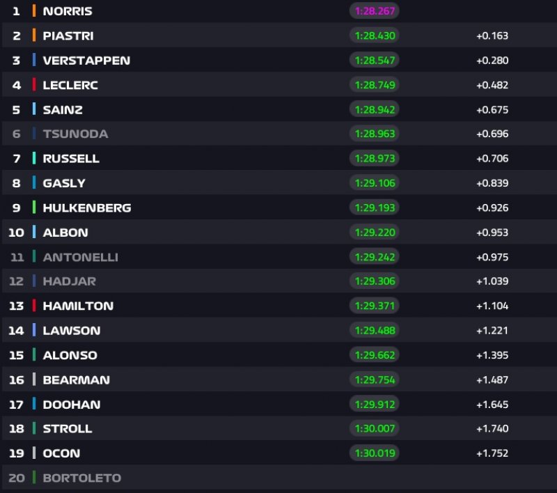 Piastri egyetlen ezreddel Norris mögé jön be a második helyre - McLaren 1-2 jelen pillanatban. Leclerc a harmadik, Verstappen, Tsunoda, Russell, Gasly a további sorrend.