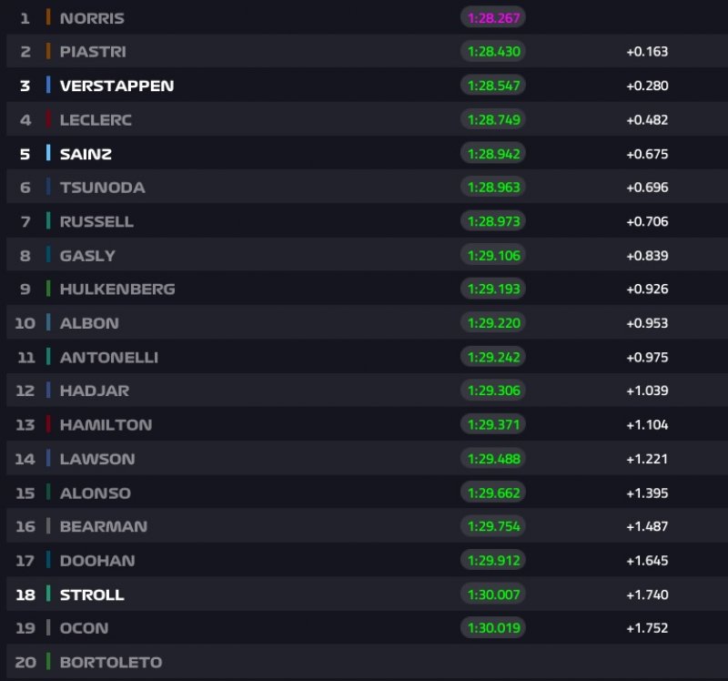 Az érdemi munkának persze már vége, így a sorrend sem változott: Norris és Piastri révén McLaren 1-2, mögöttük Verstappen, Leclerc, Sainz, Tsunoda, Russell, Gasly, Hülkenberg, Albon a top 10 sorrendje - igen, ott van egy Stake is.