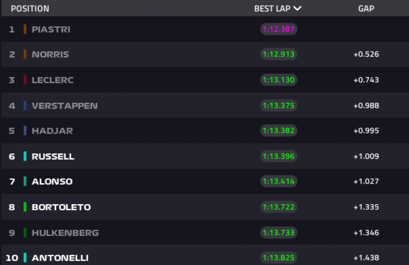 Verstappen megpróbált még egy utolsó kört a használt gumikon, de több, mint egy másodpercet kapott Piastritól. Jelenleg bődületes a McLaren fölénye, meglátjuk, hogy az időmérőre mi marad ebből.