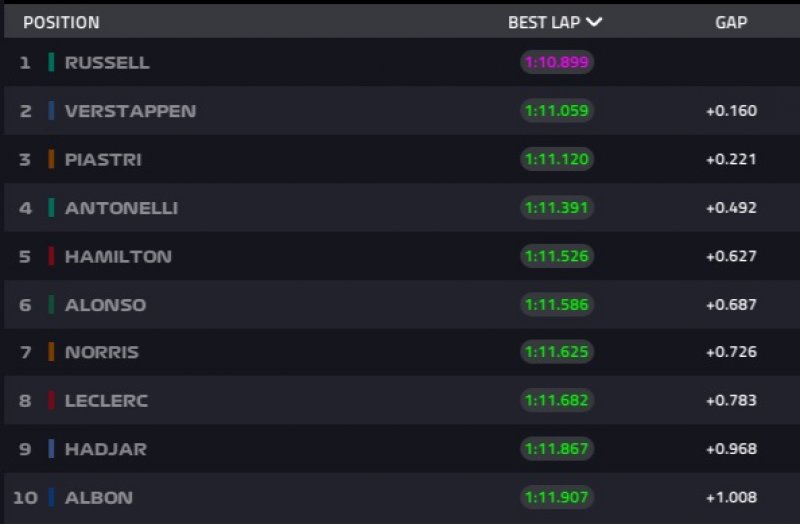 Russell, akinek nemrég még hiányoltuk a tempóját, elsőként jut tovább a Q1-be, hét századon belül van hozzá képest Norris, Leclerc és Verstappen, valamint az ötödik Piastri sincs túl messze.