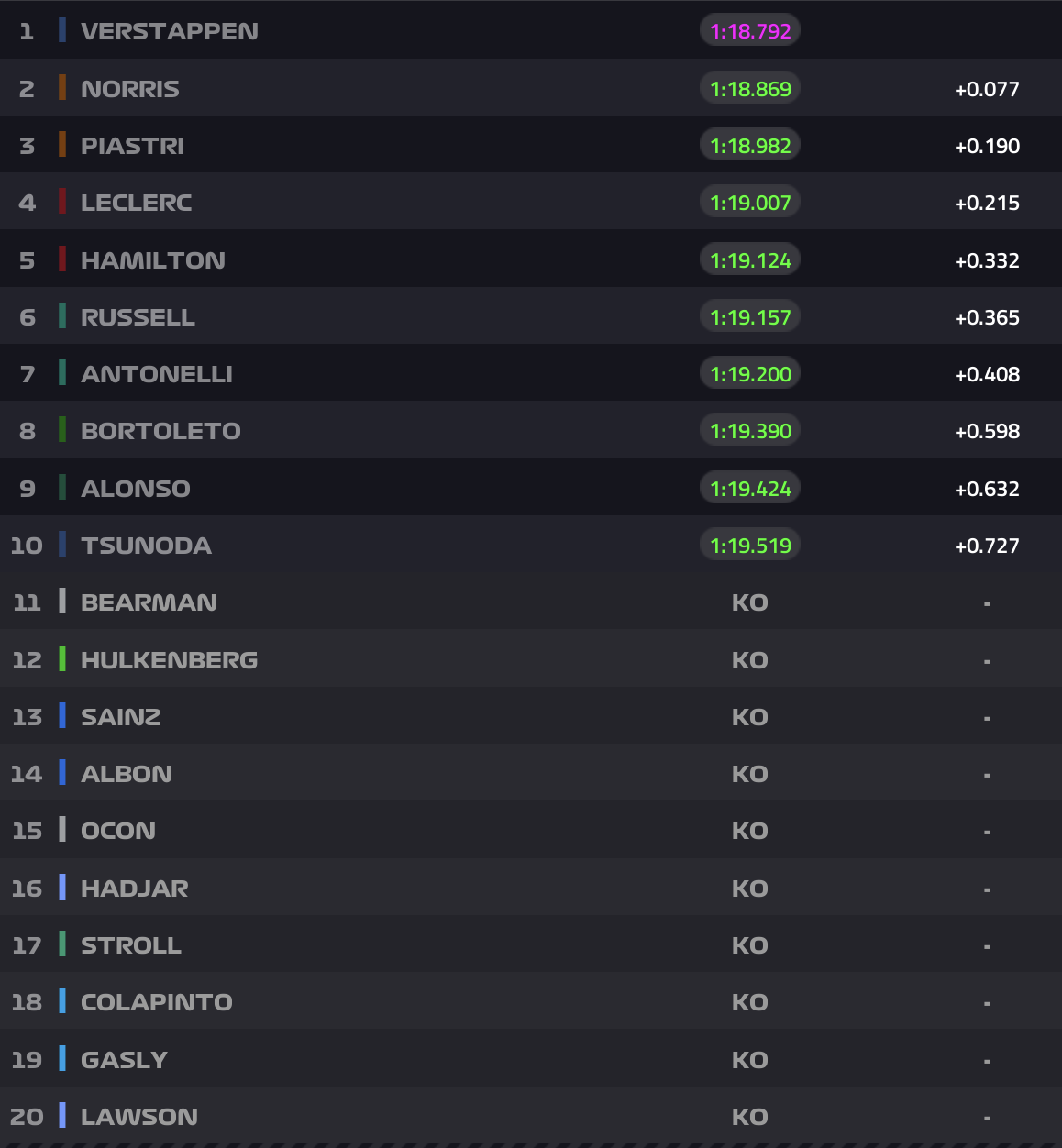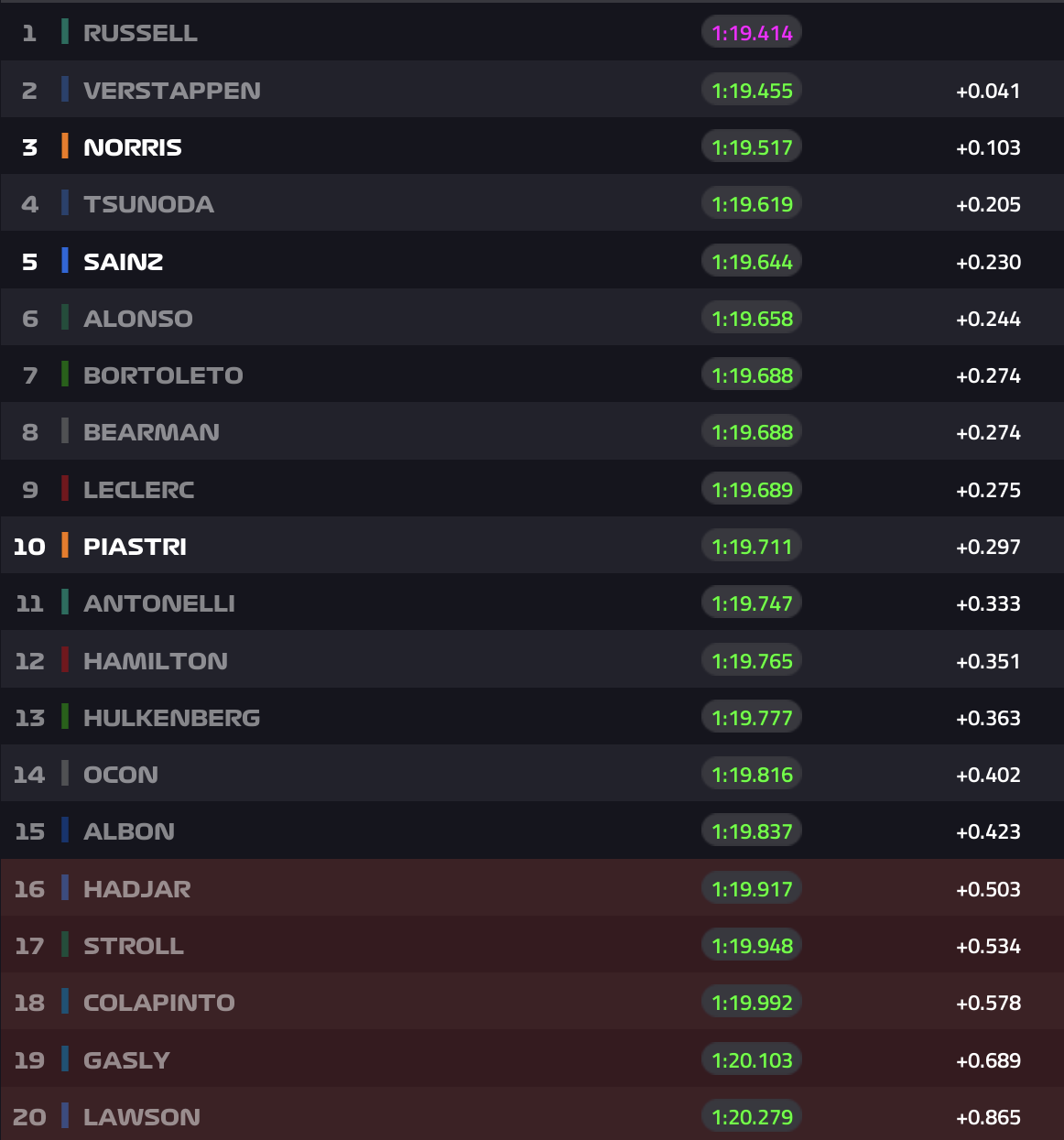 És ez ennyi is volt, a kiesők: Hadjar, Stroll, Colapinto, Gasly és Lawson.