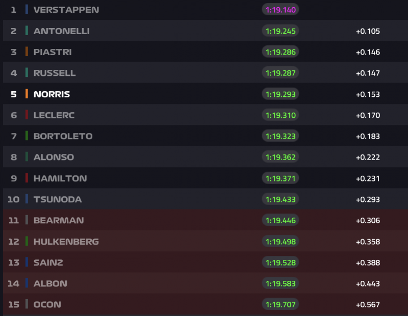 Az első gyorskörök után végül Verstappen az élen! Csupán 0,084 másodperccel előzi meg a második Leclerc-t, Piastri a harmadik. Norris mindössze a hetedik Bortoleto mögött!