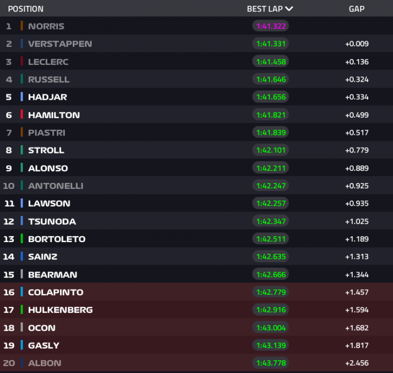 11:33 van még hátra a Q1-ből. A sorrend jelenleg az élen: Leclerc, Verstappen, Norris, Lawson. Kieső helyen Bortoleto, Colapinto, Hülkenberg, valamint az idő nélkül álló Piastri és Antonelli.