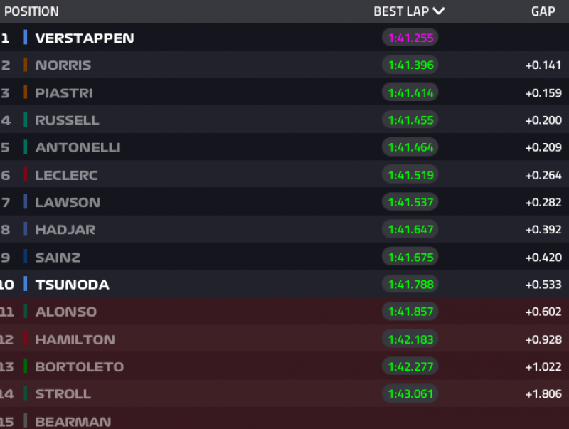 Így most az első öt sorrendje: Hamilton, Piastri, Leclerc, Verstappen, Tsunoda.