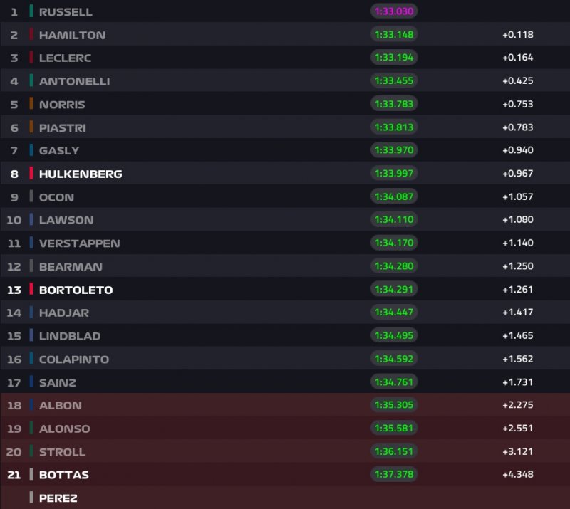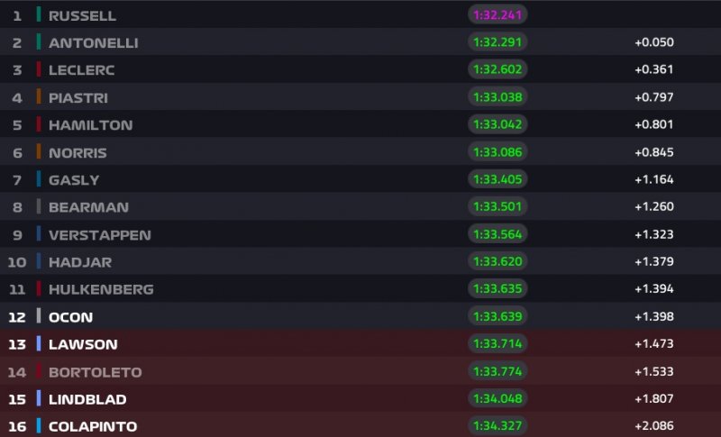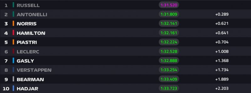 A sorrend tehát egyelőre: Russell, Antonelli, Leclerc, Piastri, Norris, Hamilton, Verstappen, Gasly, Hadjar és Hülkenberg.