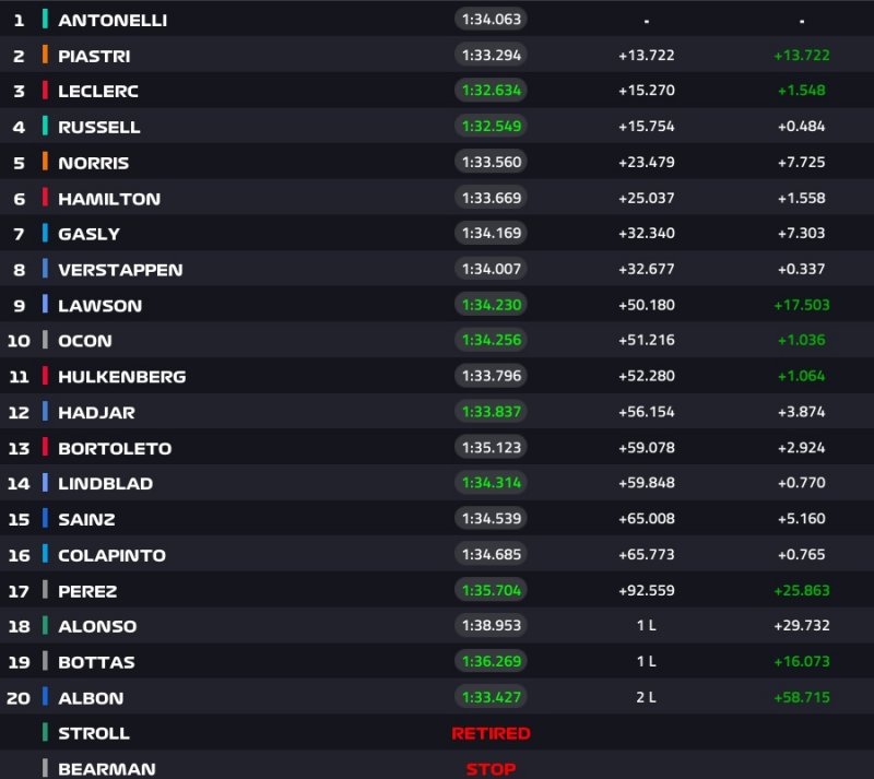 A sorrend most: Antonelli, Piastri, Russell, Hamilton, Leclerc, Norris, Gasly, Verstappen, Lawson, Bortoleto.