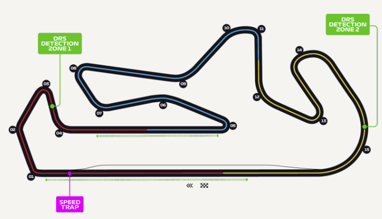 Egyúttal 120 méterrel lerövidítették a célegyenesben levő DRS-zónát, hogy ne jelentsen akkora segítséget a hátul haladónak, mint a tavalyi évben. Az aktiválási pont majdnem a célvonalnál található, és az érzékelési pont is későbbre került, a nyújtott 15-ös kanyarba.