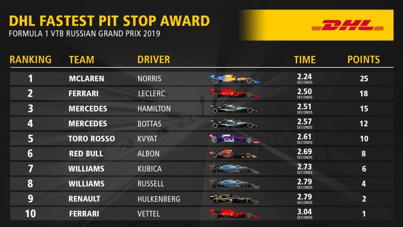 A bűvös százas határt 2014 óta először átlépő csapat abszolválta az Orosz Nagydíj leggyorsabb bokszkiállását 2,24 másodperccel Lando Norris autóján. A második nem is olyan kis lemaradással a Ferrari lett Leclerc (egyik) kiállásával.