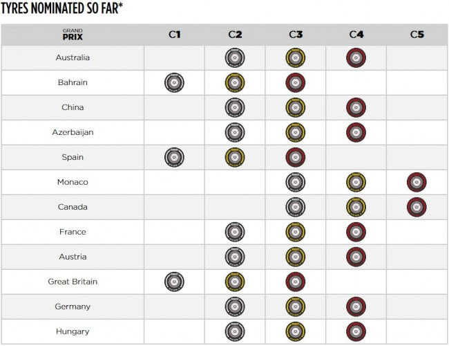 A szabályok szerint a 13 szettből egy lágyat az időmérő Q3-as szakaszára, egy közepest és egy keményet a futamra kell félretenni a csapatoknak: a maradék 10 szettet saját maguk állítják össze. A Pirelli két héttel a versenyek előtt hozza nyilvánosságra, hogyan válogattak az istállók.