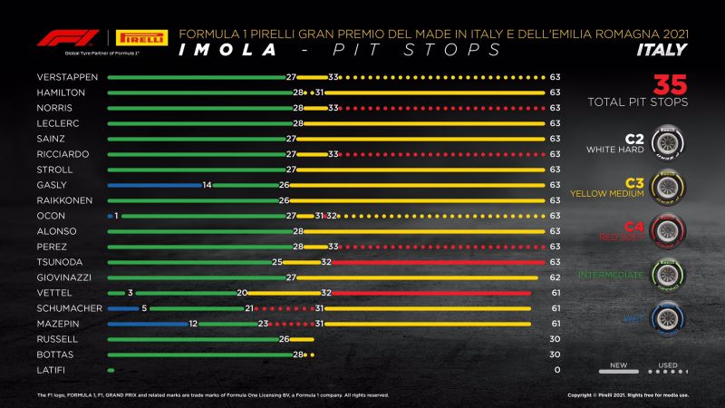 Kiadta a Pirelli a szokásos verseny utáni infografikáját a gumitaktika alakulásáról – 35 kerékcsere volt Imolában, beleértve a piros zászló alatt elvégzetteket is.