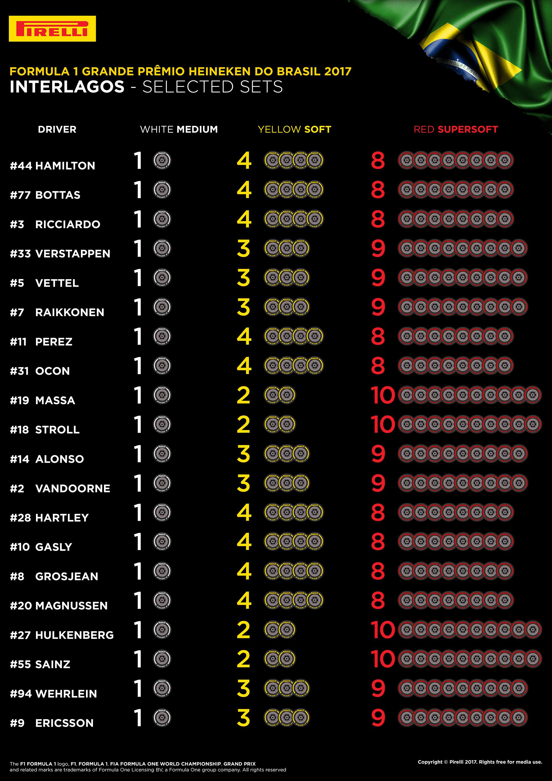 260 gumiszettből 175 lágy keverékű lesz a Brazil Nagydíjon: a rendeléseket leadó csapatok mind túlnyomóan szuperlágyakkal akarnak taktikázni a hétvégén, olyannyira, hogy az Interlagosban legkeményebb közepesből senki sem kért a kötelező szetten felül, a fő különbség pedig az, hogy 8 vagy 9 garnitúra szuperlágyat rendeltek – sőt, a Williams és Renault 10-et.