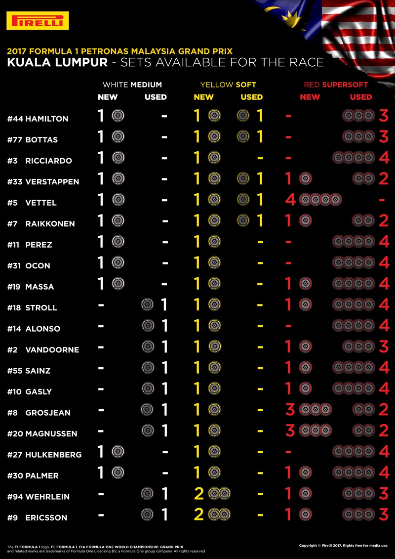 A Pirelli szokás szerint közzétette, melyik versenyzőnek hány szett áll rendelkezésére különböző keverékű abroncsokból. Az ábra alapján az élmezőnyből a második és harmadik helyről induló Kimi Raikkönennek és Max Verstappennek van még egy-egy új garnitúra szuperlágy gumija, amíg Sebastian Vettel még négy ilyen szettel rendelkezik - természetesen azért, mert egyet sem használt az időmérő edzésen.