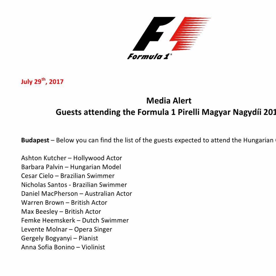 A Forma-1 kommunikációs csapata hétvégéről hétvégére kiadja, hogy milyen híreségek várhatóak a versenyen - a legnagyobb név kétségkívül a családjával régóta Budapesten vendégeskedő Ashton Kutcher hollywoodi színész, de szokás szerint feltűnik Palvin Barbara is - a teljes lista itt található: